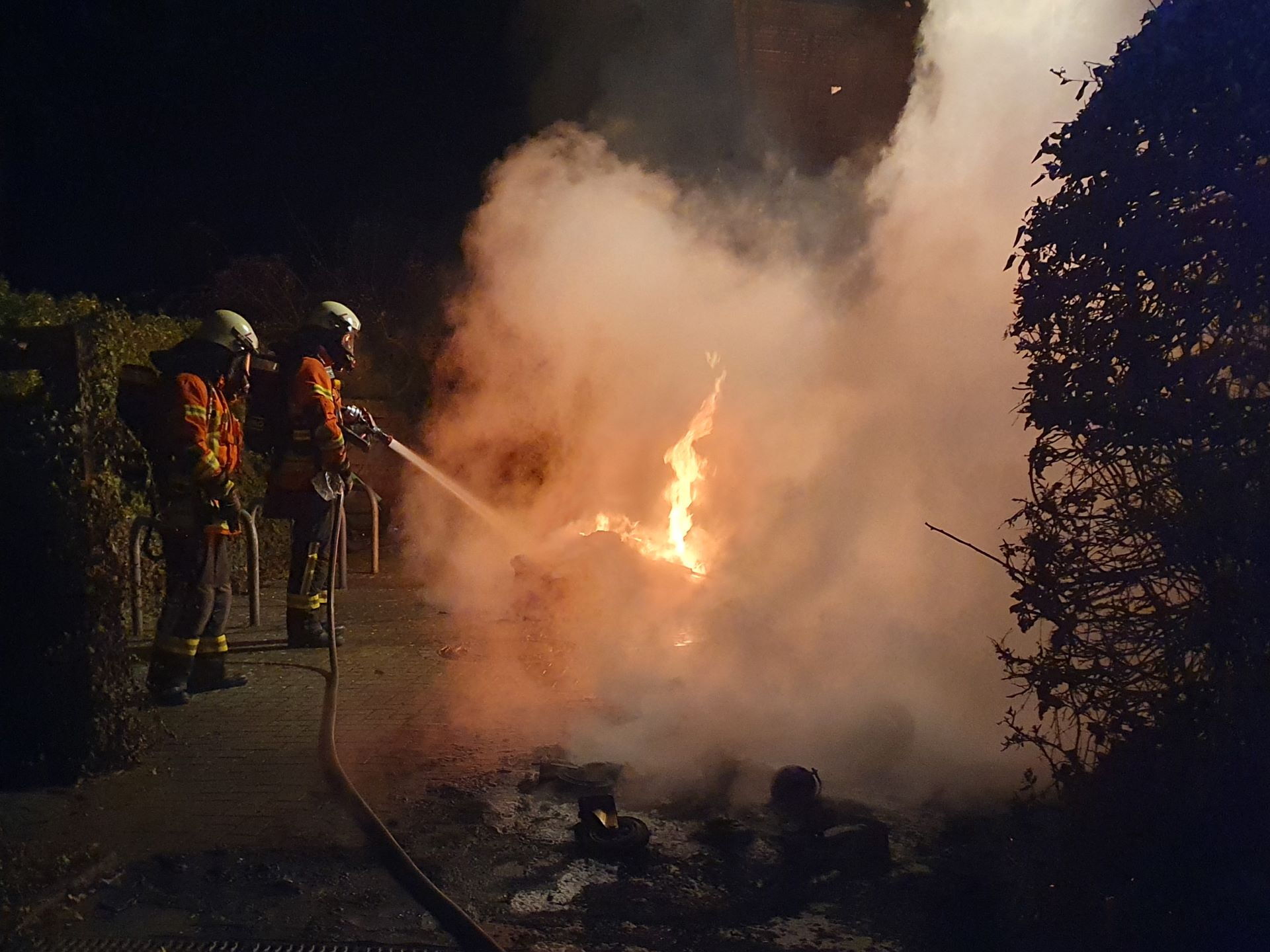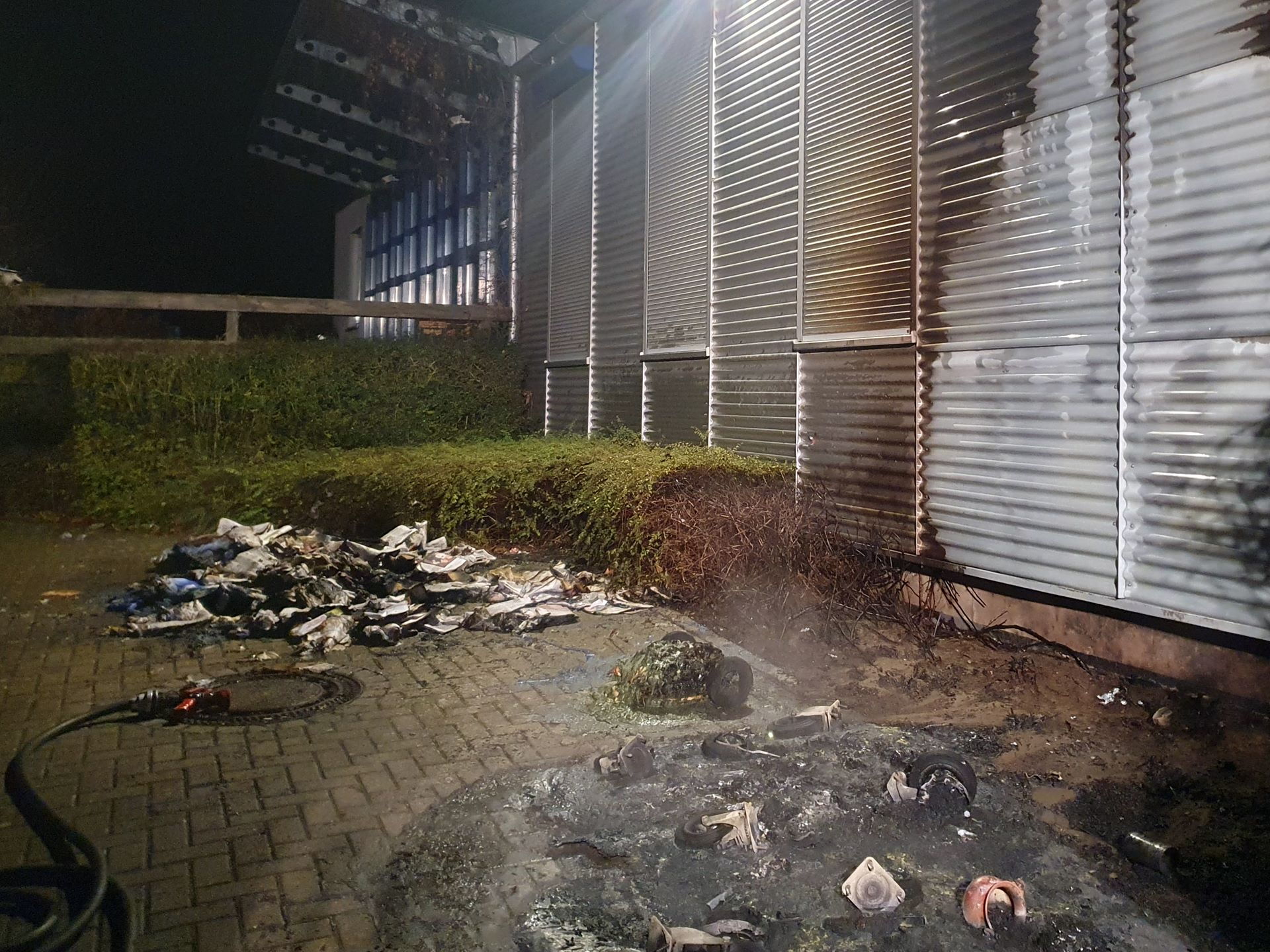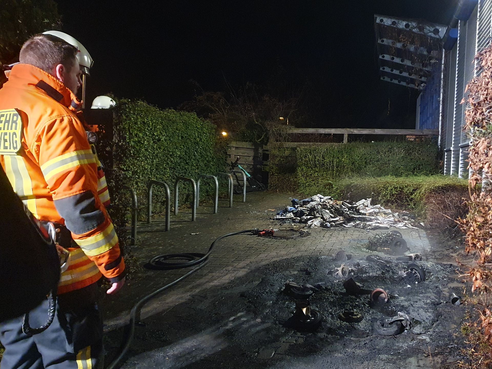 Die Ortsfeuerwehr Ölper wurde um 04:27 Uhr zu einem Containerbrand in die Julius-Konegen-Straße alarmiert. Vor Ort standen ein Wertstoffcontainer, ein Papiercontainer sowie eine Biomülltonne in Vollbrand. Ein weiterer Restmüllcontainer wurde durch die starke Hitze in Mitleidenschaft gezogen. Weiter wurde eine Wellblechfassade der anliegenden Halle beschädigt. Der Brand wurde unter PA mit Schnellangriff gelöscht und die Fassade sowie das Dach mit Wärmebildkamera kontrolliert.