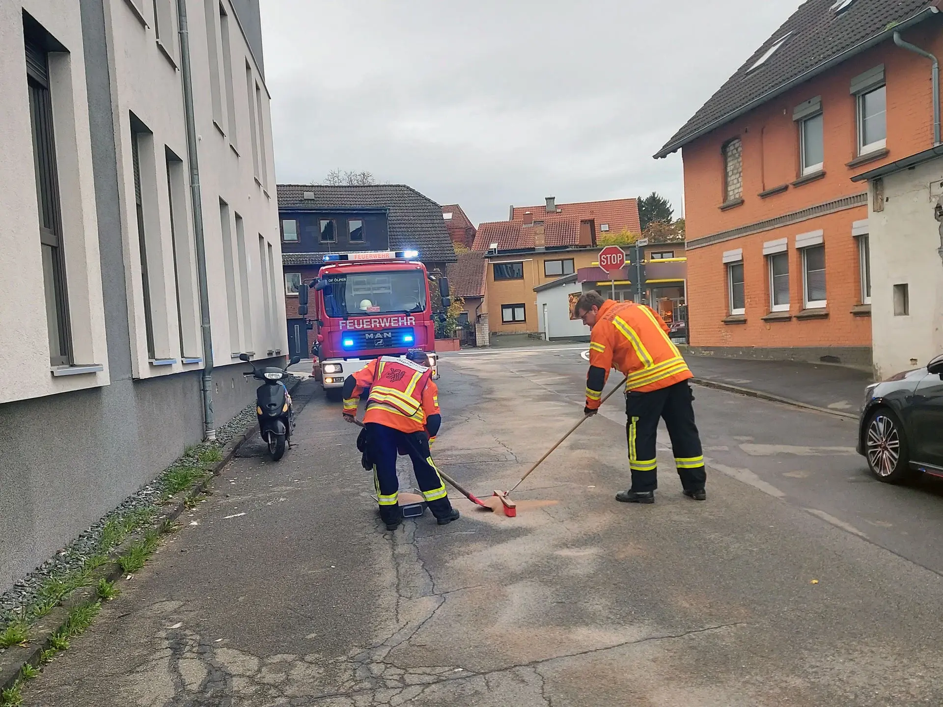 Die Einsatzkräfte verteilten das Bindemittel mit Schaufeln und Besen auf der betroffenen Fläche. Dieser Prozess machte das Öl unschädlich und ermöglichte seine sichere Entfernung. Das gebundene und somit unschädlich gemachte Öl wurde anschließend fachgerecht entsorgt, um Umweltschäden zu vermeiden.