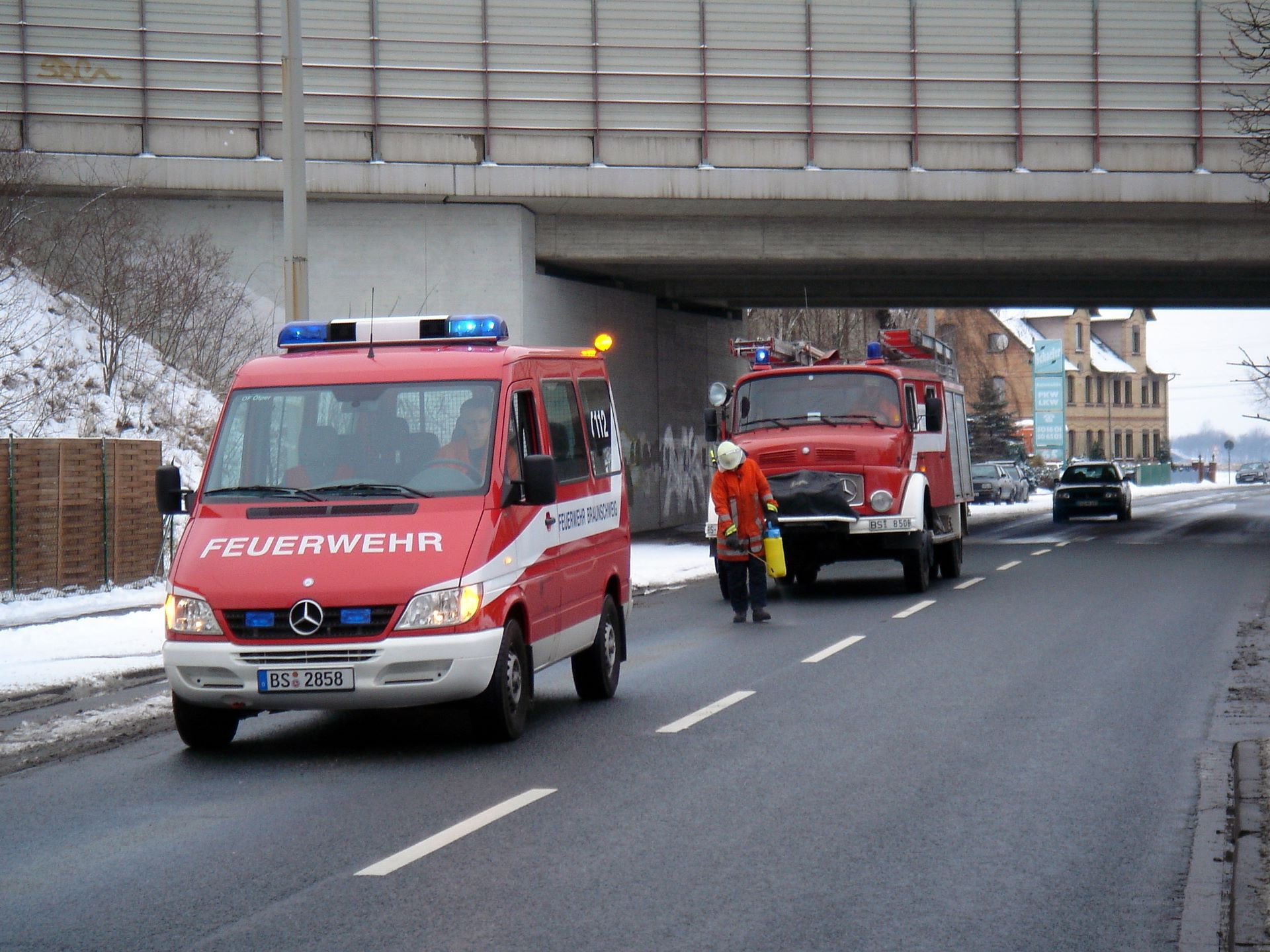 Ergänzt wurde der Blaulichtbalken durch zwei Frontblitzer. Für die Ausleuchtung im Nahbereich des Fahrzeuges war zusätzlich ein LED-Arbeitsstellenscheinwerfer verlastet.