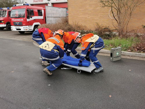 - Verkehrssicherung: Hier wurde ein Fahrradunfall simuliert. Die Jugendlichen mussten die Verkehrssicherung herstellen und die verunfallte Person mit Trage retten. Anschließend wurde sie in stabiler Seitenlage an einen Rettungsdienst übergeben.